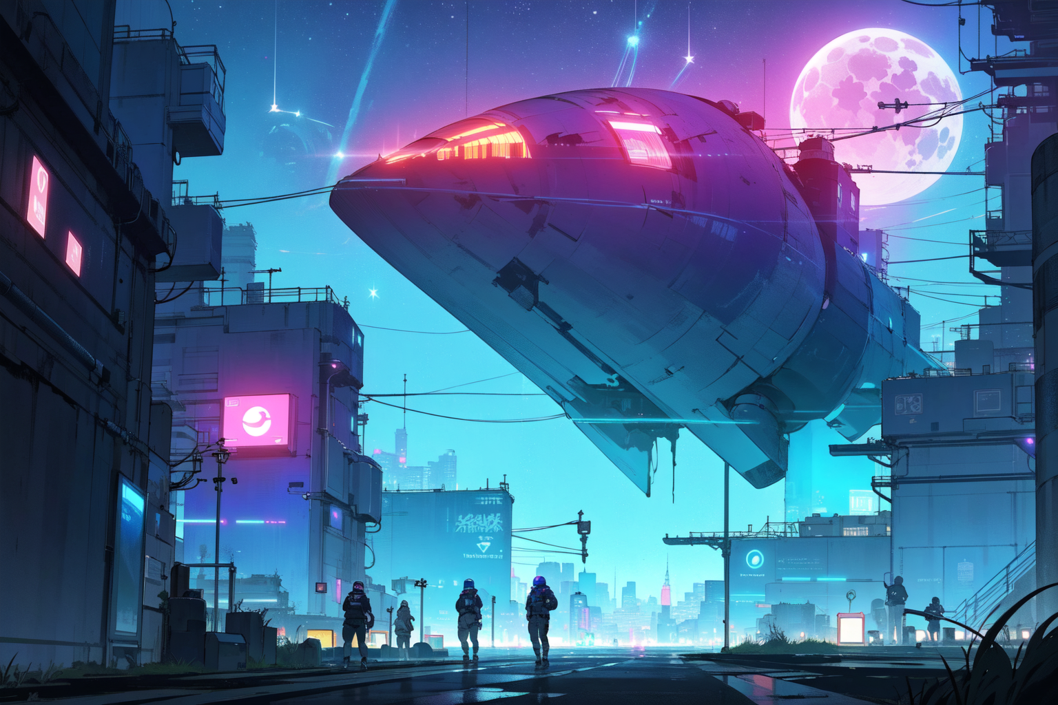 Above the cityscape, starships soar through the night sky, their sleek designs and glowing thrusters a testament to the advancements in space travel and exploration. These vessels navigate effortlessly among the stars, symbolizing humanity's reach beyond Earth and into the vast expanse of the universe. The moon looms large and luminous, casting its ethereal light over the scene and enhancing the otherworldly atmosphere.